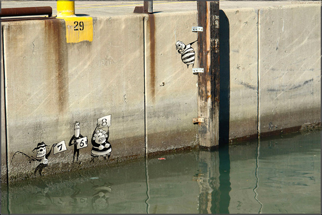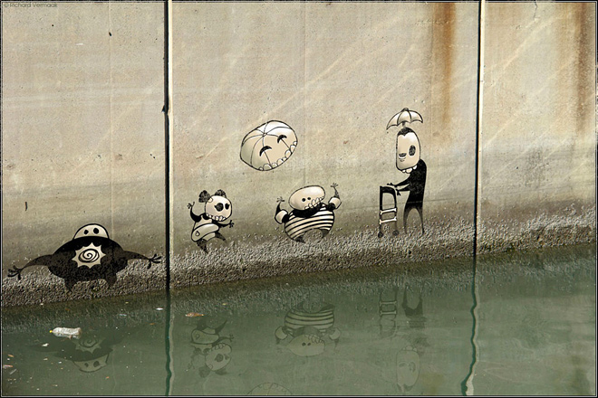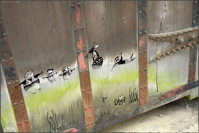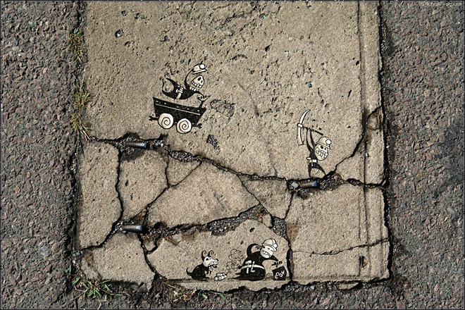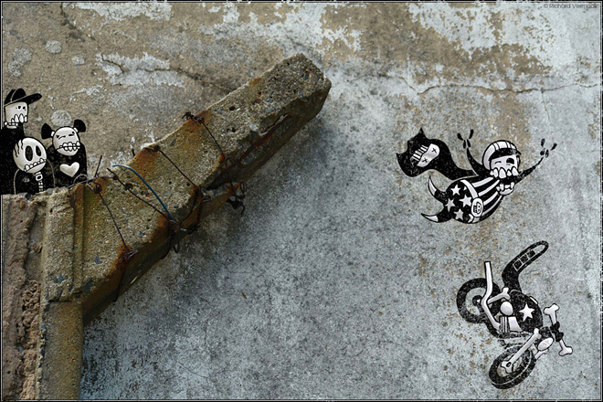 Большинство людей даже не взглянут на старые стены на улицах города. Однако художник Ричард Вермаак (Richard Vermaak) не такой, как все. Эти серые неровные поверхности для него – чистый холст, на котором можно творить. Именно структура стен городских построек, мусор, различные камни и прочее вдохновляют автора на новые творения, порождают идеи, которые находят воплощения прямо на месте. Герои Ричарда Вермаака именуются Skelewags и всегда находят способ ввязаться в мелкие неприятности. Его креативности нет границ, а все персонажи придуманы по мотивам Дня Мертвых – мексиканского праздника, посвященного памяти умершим. Предлагаем взглянуть на миниатюрный мир Skelewags от Ричарда Вермаака в рамках нашей с вами действительности.