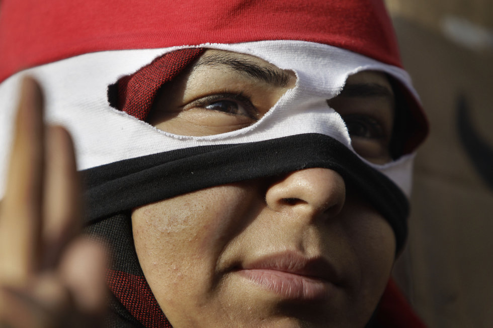 13. Антиправительственная демонстрантка в маске цвета египетского флага на металлических перилах над толпой в Каире. (AP Photo/Ben Curtis)