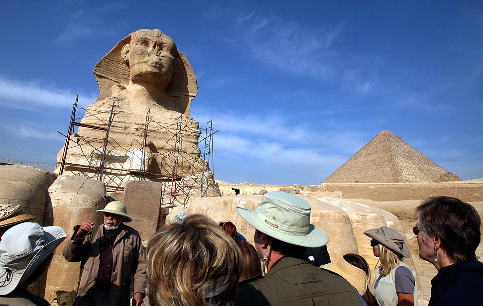 5. Туристы слушают экскурсовода неподалеку от Сфинкса в Гизе. Египетские пирамиды снова открыты для посещения туристами, несмотря на продолжающиеся вот уже три недели беспорядки в стране. (Khalil Hamra / Associated Press)