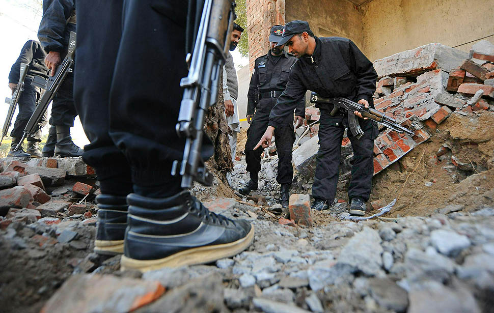 8. Представители власти осматривают место взрыва, который произошел за полицейским участком в пакистанском городе Гуджранвала. (ARIF ALI / AFP/Getty IMages)