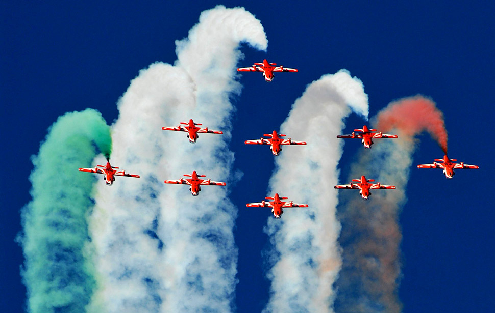 16. Выступление пилотажной группы ВВС Индии в день открытия "Аэро Индия 2011", 8-го Международной авиационно-космической выставки в индийском городе Бангалор. (JAGADEESH NV / EPA)