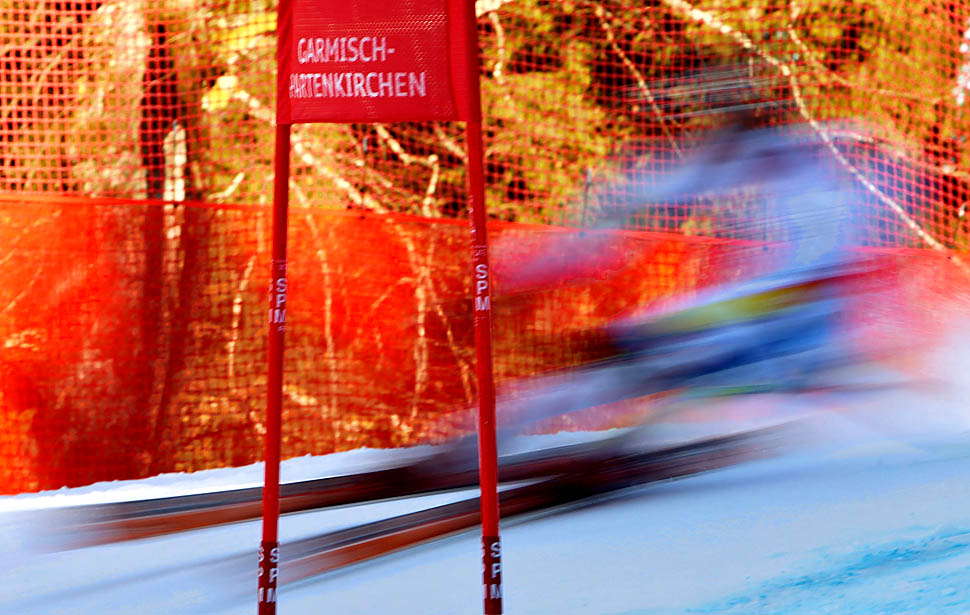 20. Лыжник на высокой скорости проезжает через ворота во время гонки среди мужчин на Чемпионате мира по горнолыжному спорту в Гармиш-Партенкирхен. (KARL-JOSEF HILDENBRAND / EPA)