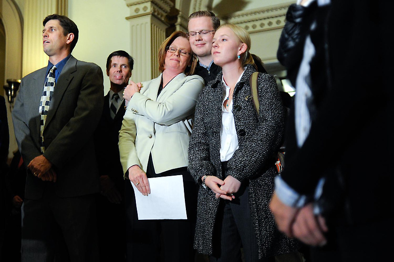11. Келли Джанс со своим вторы сыном Дастином Снейкенбергом после ее выступления на обсуждении законопроекта, направленного на предотвращение спортивных травм среди молодежи, состоявшегося 10 февраля 2011 года.