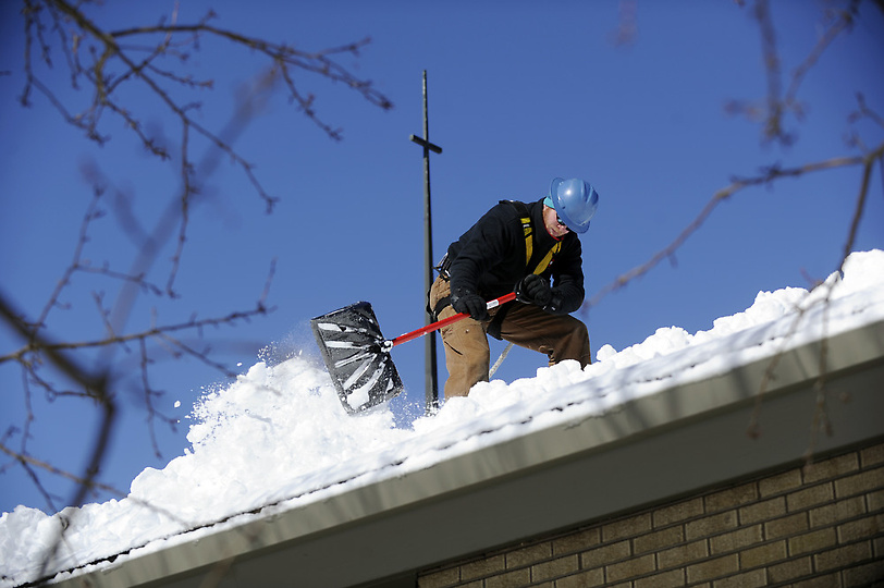 18. Установщик солнечных батарей фирмы «Намаст Солар» в полной амуниции очищает снег с крыши пресвитерианской церкви на Колорадо Бульвар около Корнел Айв в среду, подготавливая крыша к установку сорока панелей солнечных батарей.