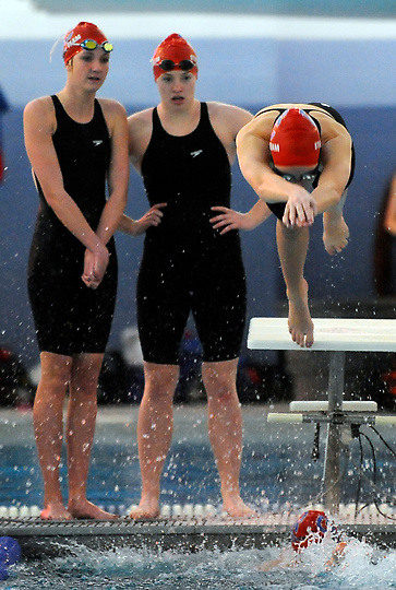 6. Женская команда по плаванью школы Фэавью Хай во время смешанной эстафеты с дистанцией 182 метра подготовительного этапа регионального чемпионата по плаванью 11 февраля 2011 года.