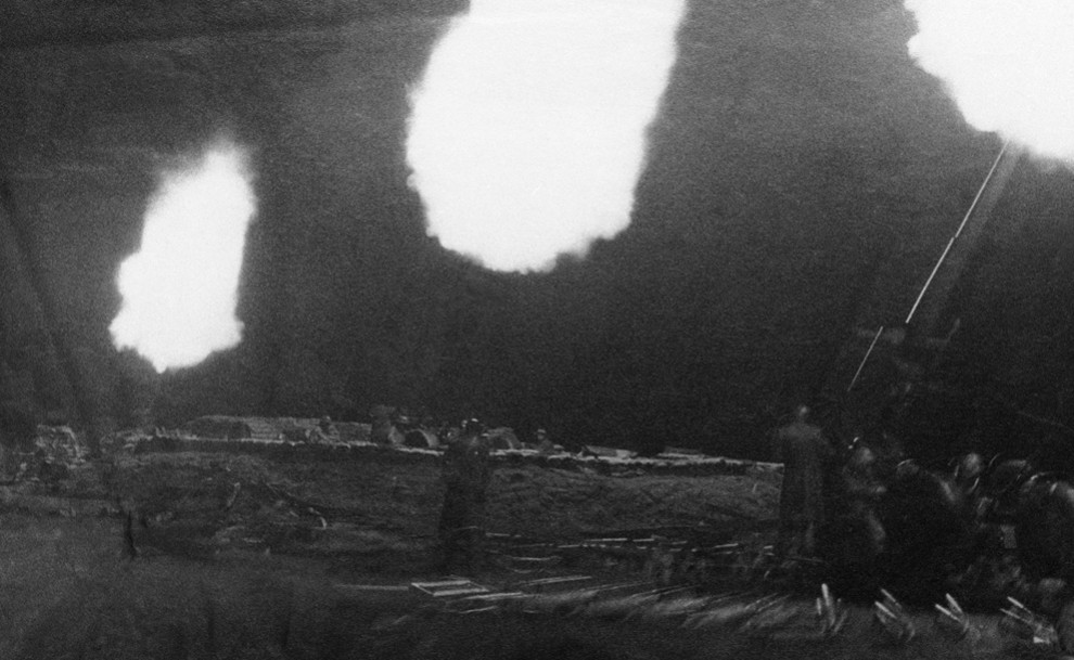 3. Три зенитки в темноте в Лондоне 20 сентября 1940 года во время обстрела немецких самолетов. Ряды снарядов уложены за орудиями. (AP Photo)