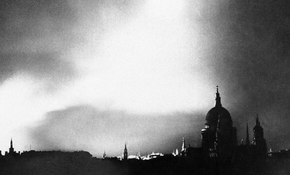 1. Неповрежденный купол собора святого Павла в клубах дыма и огня от окружающих зданий во время бомбардировки немецкими самолетами Лондона 29 декабря 1940 года. (AP Photo/U.S. Office of War Information)