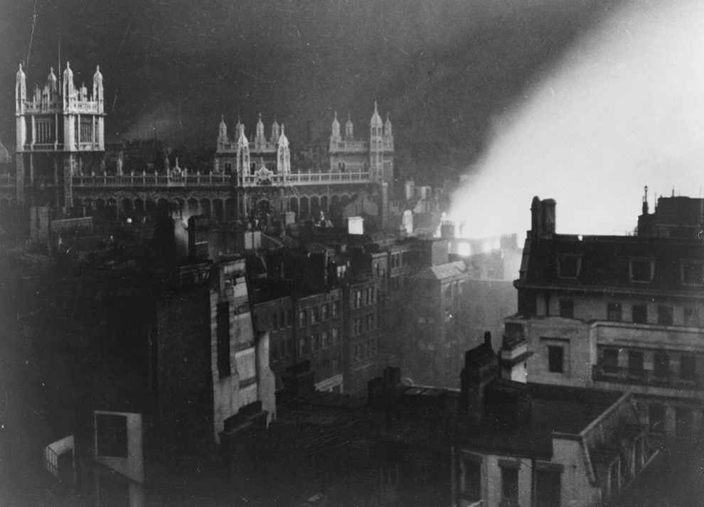 16. Силуэт Вестминстерского дворца в Лондоне на фоне света от снарядов. (Library of Congress)