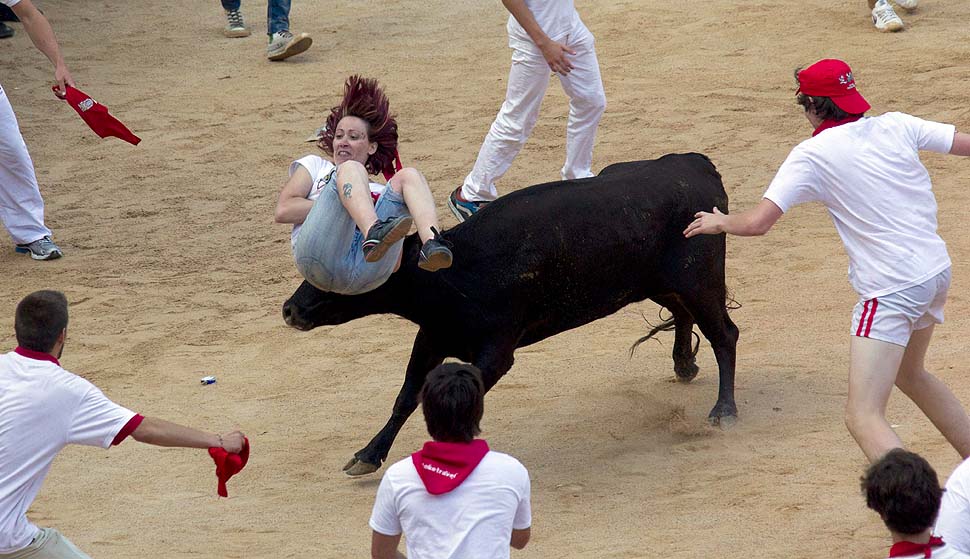1. Бык подкинул девушку на арене в Памплоне, Испания, во время забега с быками. После того, как быки пробегут по улицам, их запускают на арену на потеху тысячам зрителей. (JIM HOLLANDER / EPA)