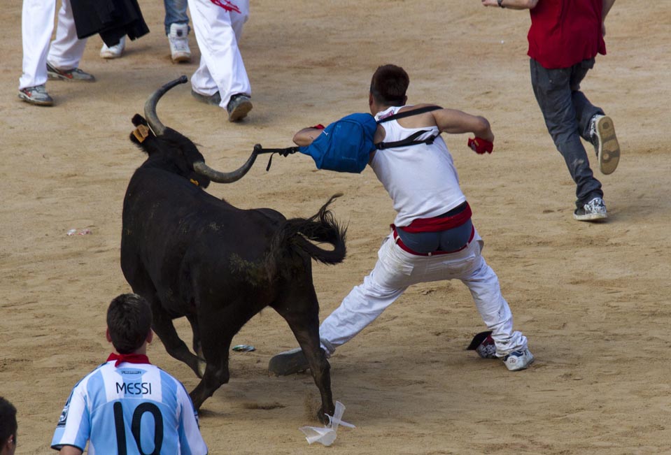 13. Корова подцепила лямку рюкзака одного из участников забега с быками в Памплоне. (Jim Hollander/European Pressphoto Agency)