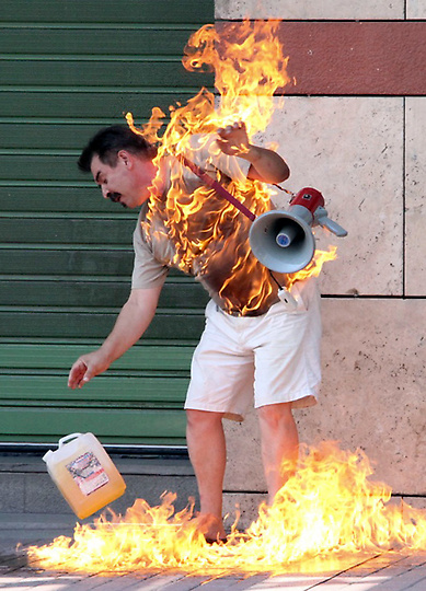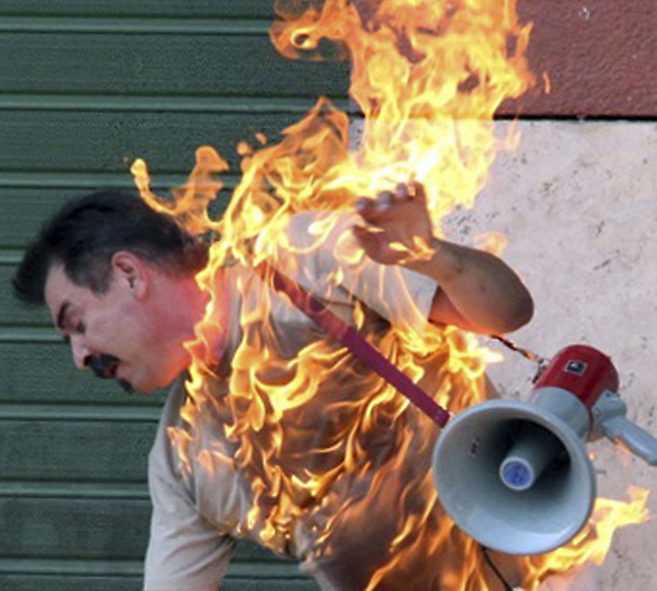 7. И на этот раз полиции удалось потушить огонь, неудачливого самоубийцу доставили в больницу с небольшими ожогами груди. По словам медиков, угрозы его жизни нет.