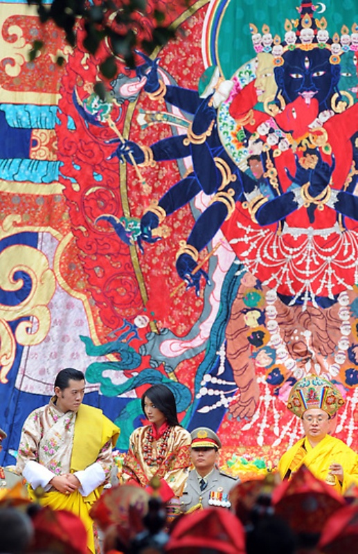 5. Его величество король Джигме Кхесар Намгьял Вангчук, рядом со своей невестой, королевой Джецун Пема, во время церемонии в историческом замке Пунакха-дзонг (Дворец Блаженства). Обряд проходил в монастыре 17 века, согласно всем древним традициям буддийской культуры.