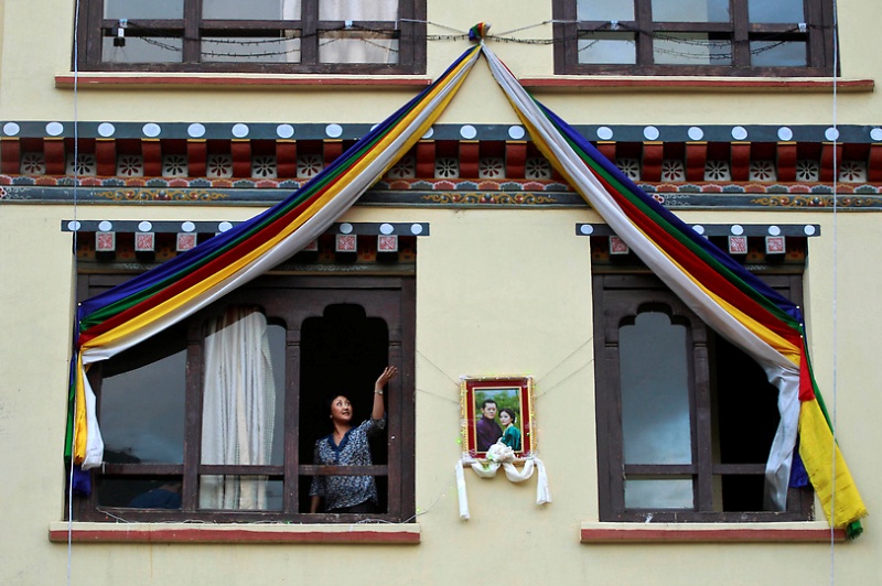 16. Бутанская женщина выглядывает из своего дома рядом с портретом короля Джигме Кхесара Намгьяла Вангчука и будущей королевы Бутана Аши Джецун Пемы Вангчук, 12 октября 2011 года в Тхимпху. В стране проходили последние приготовления к королевской свадьбе.