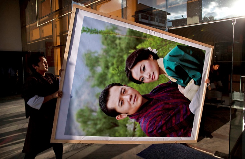 13. Бутанские рабочие несут большой плакат с изображением короля Джигме Кхесара Намгьяла Вангчука и будущей королевы Джецун Пемы в здание банка в Тхимпху, столице Бутана, 12 октября 2011 года.