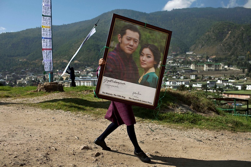 24. Бутанский студент несет портрет короля Джигме Кхесара Намгьяла Вангчука и будущей королевы Джецун Пемы, прежде, чем повесить его за пределами школы Lungten Zanpa School, их альма-матер в Тхимпху, столице Бутана.