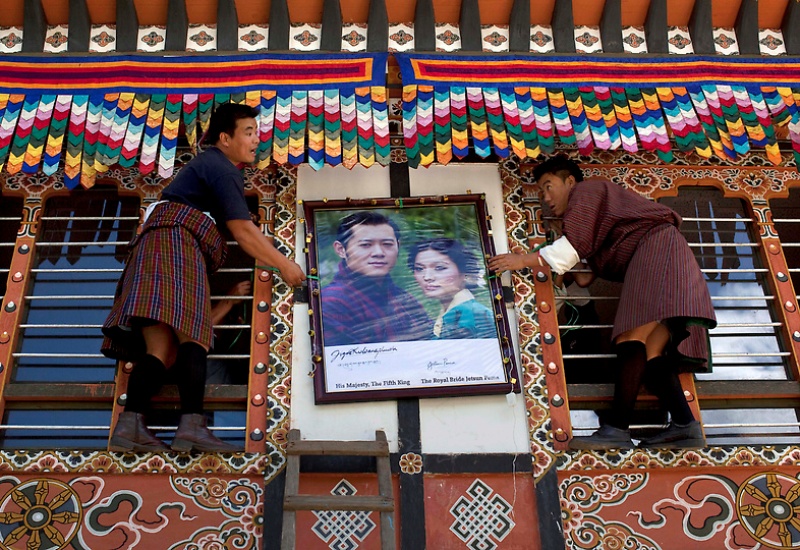 25. Бутанские сотрудники школы и студенты устанавливают портрет короля Джигме Кхесара Намгьяла Вангчука и будущей королевы Джецун Пемы вне школы Lungten Zanpa School в Тхимпху.