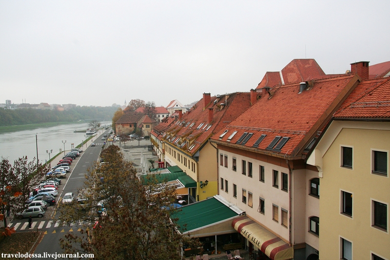 Мы вышли к мосту, который соединяет старый город с той частью, где расположены горные курорты и жилые районы. Кстати, Марибор относительно недавно официально стал альпийским городом. На местном Погорье активно развивается горнолыжный туризм. А речка, которая разделяет Марибор имеет весьма интересное название - Драва. То есть, если летом там искупаться, можно смело говорить "Я в дравах" :)