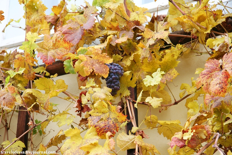 А вот и растущая еще гроздь винограда. Дотянуться и попробовать конечно не получается. Я думаю, что ее специально оставили для туристов, в качестве доказательства о том, что виноградник еще способен давать плоды
