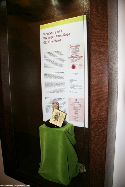 Тут же находится и музей вина. Вход бесплатный. Первое, что мы видим - это то самое вино, сделанное из старого виноградника. По словам смотрителей музея, ежегодно виноградник дает до 100 небольших бутылочек вина, которые идут в ценный фонд подарков для особо важных персон. Подтверждением этому служит благодарственное письмо от Билла Клинтона из администрации президента США, датированное 1998 годом, где довольный Билл благодарит муниципалитет Марибора за столь теплый прием и восхитительное вино, а заодно просит прислать ему еще бутылочку