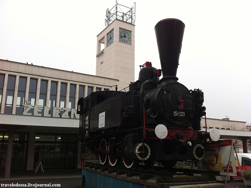 Привлек внимание памятник старому локомотиву у входа на вокзал. Уже на следующий день, мы будем наблюдать точно такие же локомотивы абсолютно на каждой остановке поезда вплоть до самой Любляны!