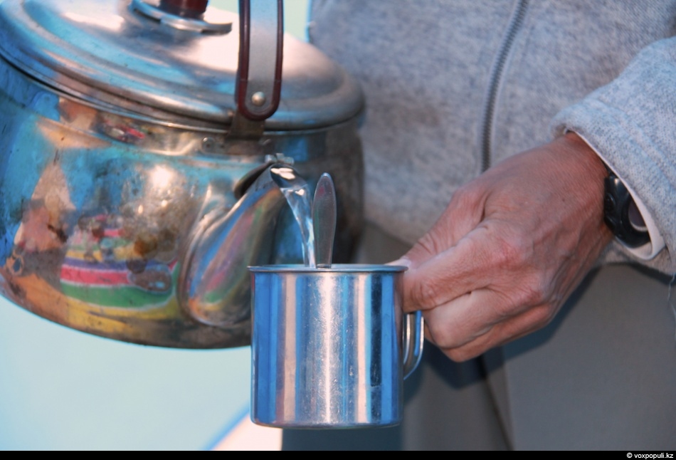 23. 13 июля. В три часа ночи на моем телефоне сработал сигнал - пора вставать. Собираемся по очереди, затем зажигаем горелку и греем в кастрюле воду. На завтрак только кофе «3 в 1» и один шоколадный батончик на двоих (фото Пивцов В.)