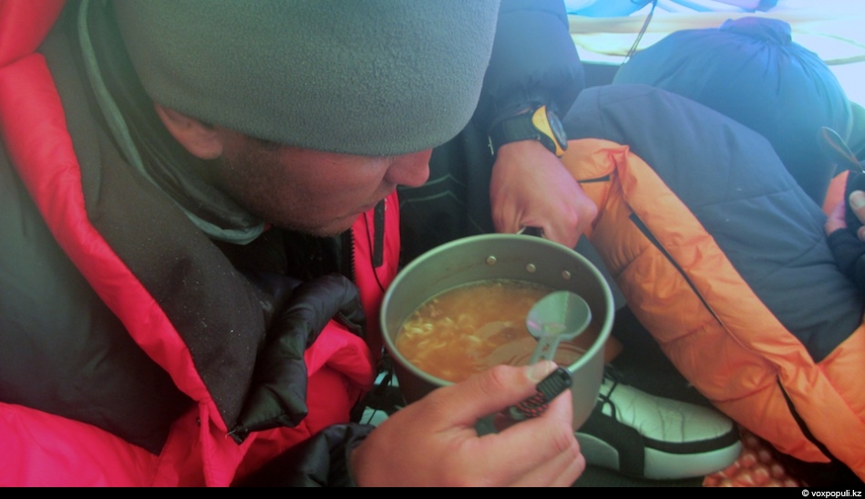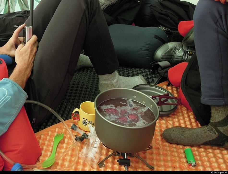 19. Палаточная жизнь проста и незамысловата. Одна большая кастрюля на четверых. Основная задача – восстановить водный баланс. За день альпинист теряет до 3 литров жидкости, в основном через дыхание. Вода нужна, чтобы кровь не загустела, а иначе повышается вероятность обморожения (фото Пивцов В.)
