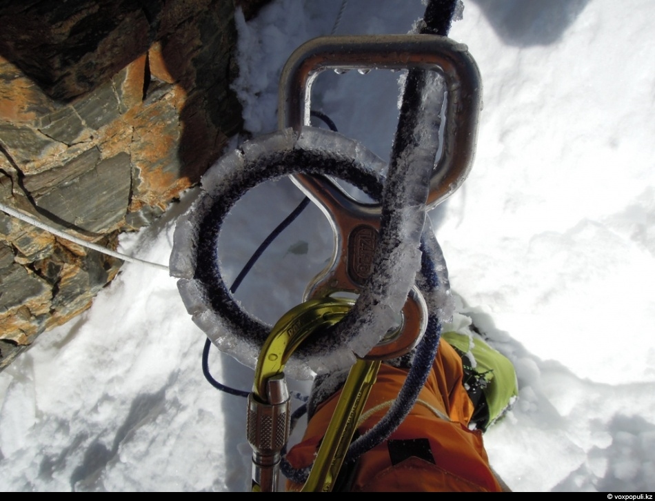 42. Еще одна проблема - на переходе из 1 во 2 лагерь, по кулуару текла талая вода, перильная веревка постоянно обледеневала и вмерзала в лёд (фото Ральф Д.)