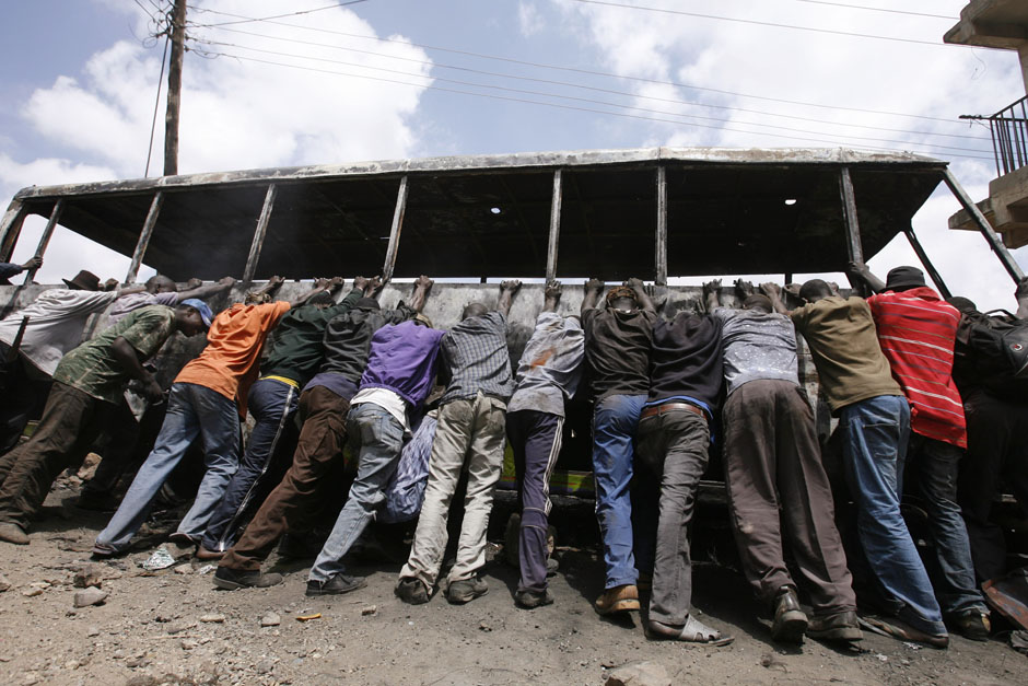 11. Демонстранты пытаются перевернуть сгоревший автобус во время протестов против полицейского рейда на трущобы Матхаре, Найроби, 20 февраля 2008 года. (REUTERS/Zohra Bensemra)