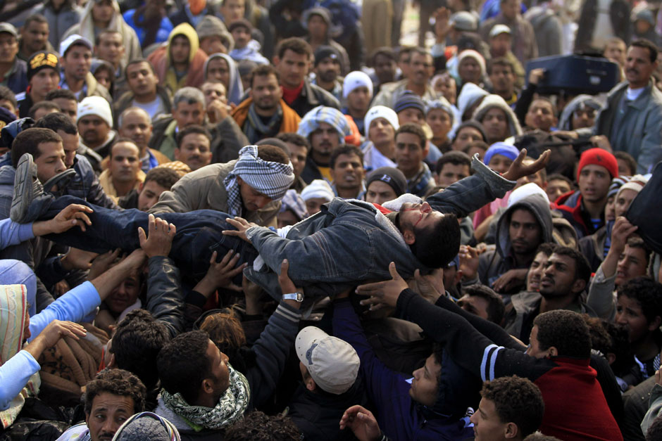 12. Египетские беженцы у тунисской границы несут на руках потерявшего сознание мужчину, 1 марта 2011 года. (REUTERS/Zohra Bensemra)