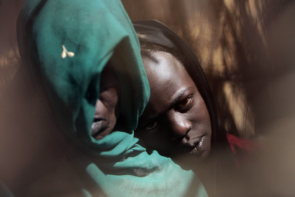 28. Одиннадцатилетняя Фатна Адам Хамед (справа), которую изнасиловали неизвестные вооруженные люди, прижимается к плечу матери в лагере для внутренних беженцев в Ньяле, Судан, 18 марта 2009 года. (REUTERS/Zohra Bensemra)
