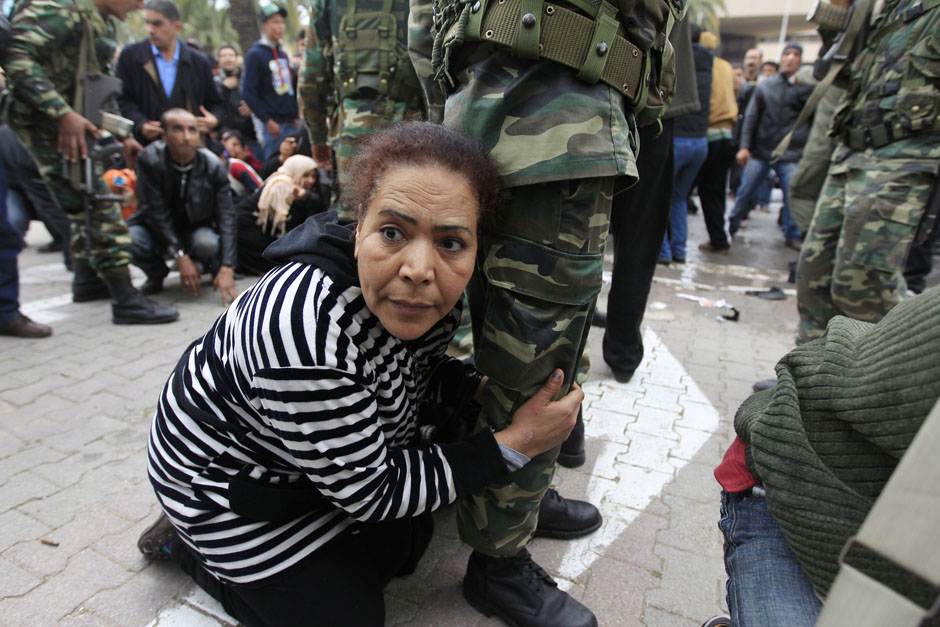 31. Демонстрантка хватается за ногу солдата, услышав выстрелы в воздух во время акции у штаба партии смещенного президента Зина Аль-Абдина Бен Али в Тунисе, 20 января 2011 года. (REUTERS/Zohra Bensemra)