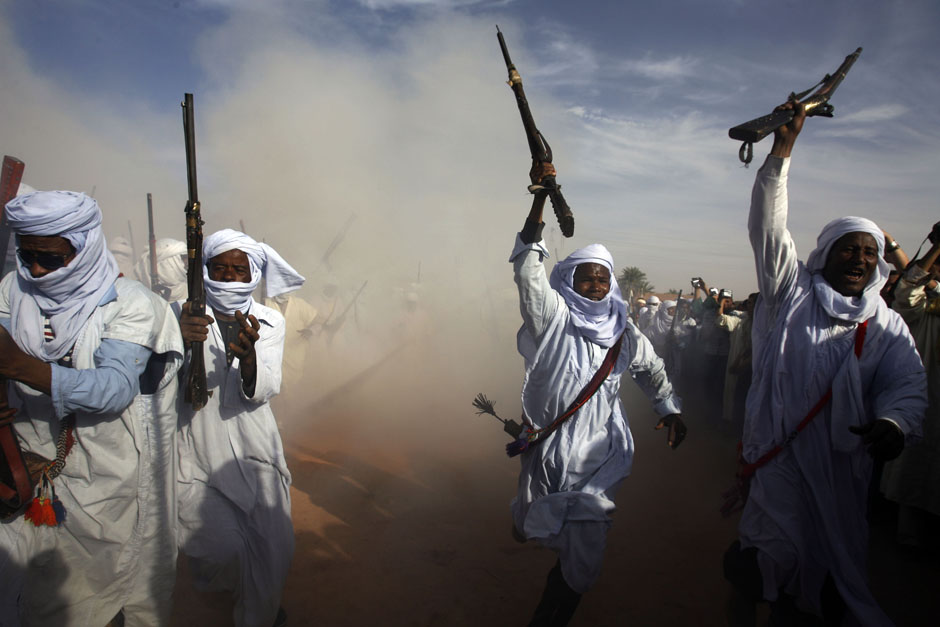 35. Представители "Сахаб эль Баруд" стреляют из церемониальных мушкетов в последний день празднований в честь рождения Пророка Мухаммеда, 26 марта 2008 года, Тимимун, Алжир. (REUTERS/Zohra Bensemra)