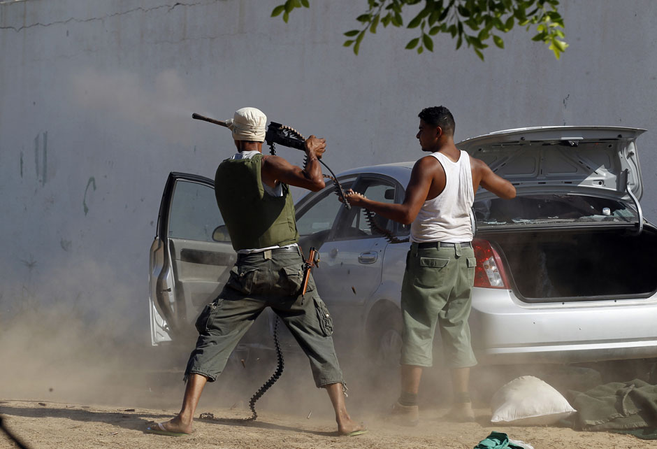 40. Ливийские революционеры ведут огонь из пулемета по снайперу, Триполи, 24 августа 2011 года. (REUTERS/Zohra Bensemra)