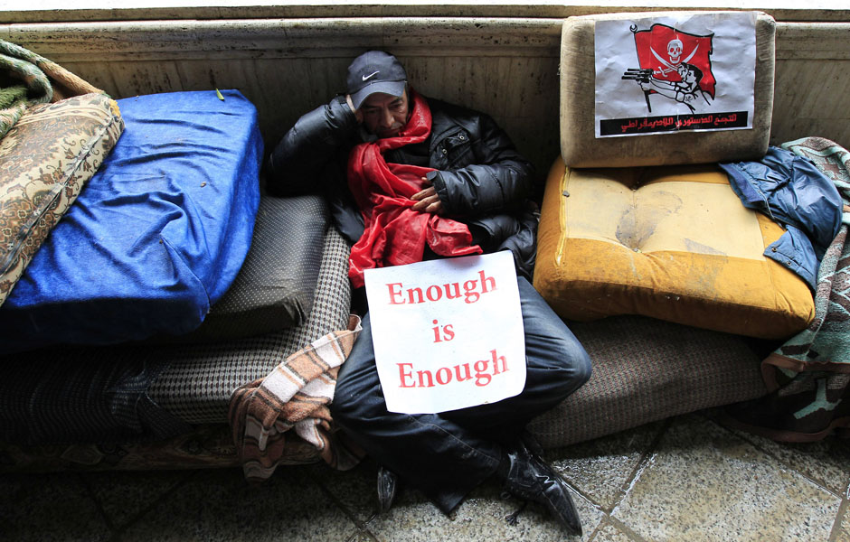 44. Протестующий сидит на матрасе во время демонстраций у кабинета премьер-министра в Тунисе, 27 января 2011 года. (REUTERS/Zohra Bensemra)