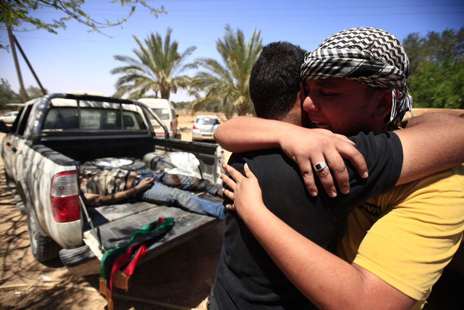 49. Ливийские повстанцы оплакивают погибшего товарища в полевом госпитале возле Мисраты, 10 июня 2011 года. (REUTERS/Zohra Bensemra)