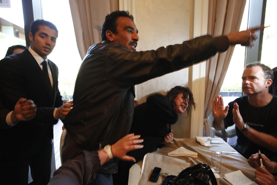 57. Эман Аль-Обайди (в центре) и представители властей (слева) в отеле в Триполи, 26 марта 2011 года. Эман Аль-Обайди в надежде на помощь вбежала в отель, где проживали иностранные журналисты, и стала показывать им шрамы и синяки, которые, по ее словам, остались от побоев боевиками Каддафи. Вскоре приехали сотрудники служб безопасности и забрали ее, несмотря на попытки помешать им. В результате драки пострадало несколько журналистов. (REUTERS/Zohra Bensemra)