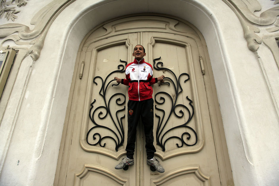 64. Мальчик висит на двери и выкрикивает лозунги во время антиправительственной демонстрации в Тунисе, 25 января 2011 года. (REUTERS/Zohra Bensemra)