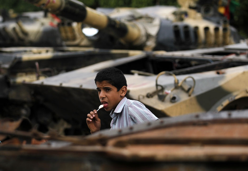 68. Мальчик рядом с бронетехникой, захваченной ливийскими повстанцами в Мисрате, 2 июня 2011 года. (REUTERS/Zohra Bensemra)