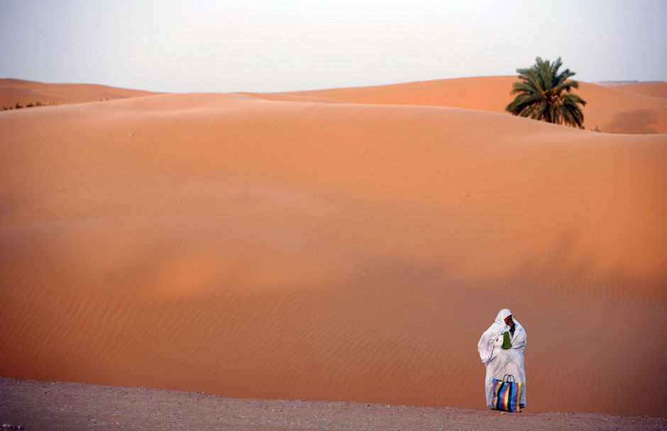 75. Женщина ждет транспорта на окраине города Тимимун, 1200 км от Алжира, 24 марта 2008 года. (REUTERS/Zohra Bensemra)