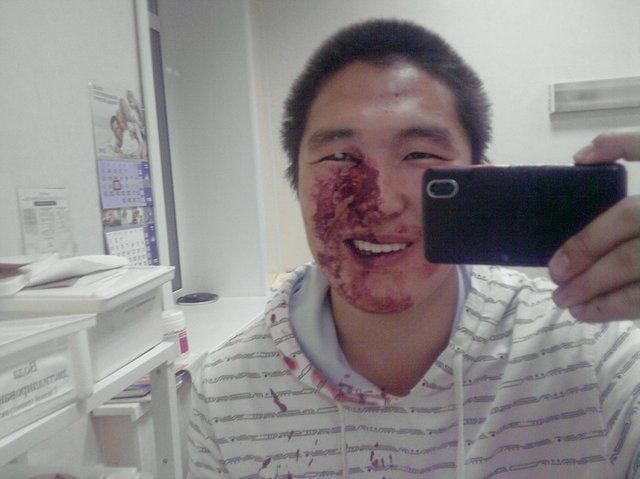 не драка) тренировка, панкратион! делал проход в ноги, а соперник вывел ногу на лоу, и получилось что напаролся на колено!! результат!)) разсечение!) 4 шва)