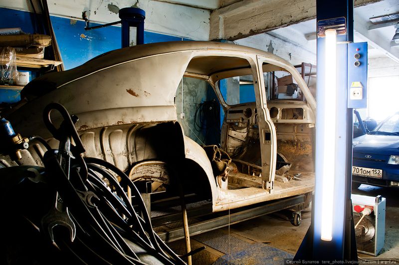 -- Тут с каждым своя история. Например, эта машина, которую мы восстановили, простояла в гараже 20 лет, после того, как умер ее владелец. Мы ее купили за смешные 40 тысяч (тогда еще не началась программа утилизации старых автомобилей, от которой мы эту Победу вероятно спасли). Далее по объявлению мы купили еще 2 Победы, одну разобрали и большую часть выкинули, а другая сейчас в виде кузова после пескоструйной обработки, ты ее видел в гараже на подъемнике. (см. фото в начале статьи)