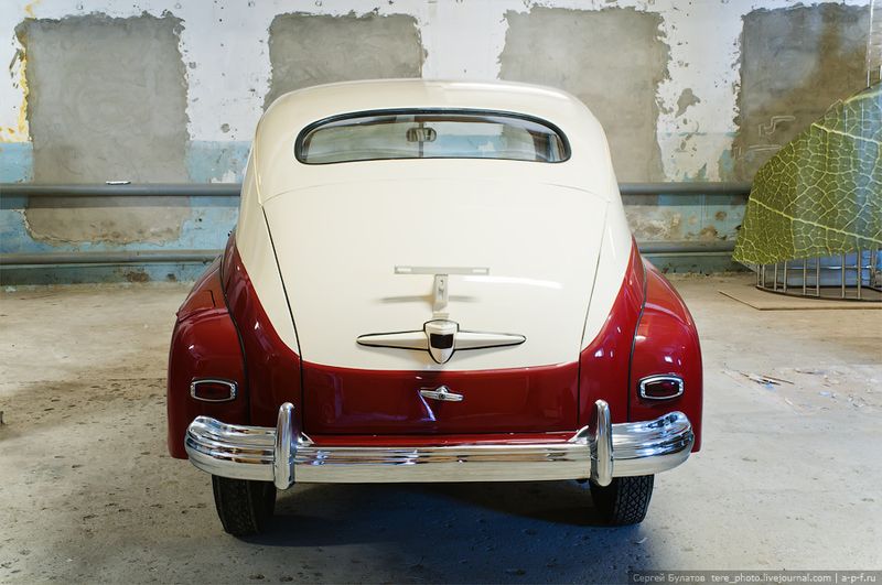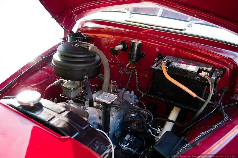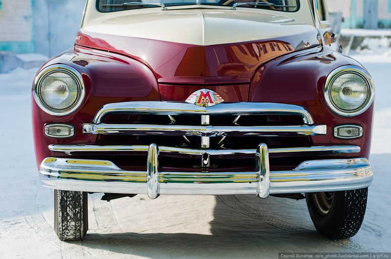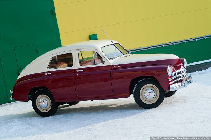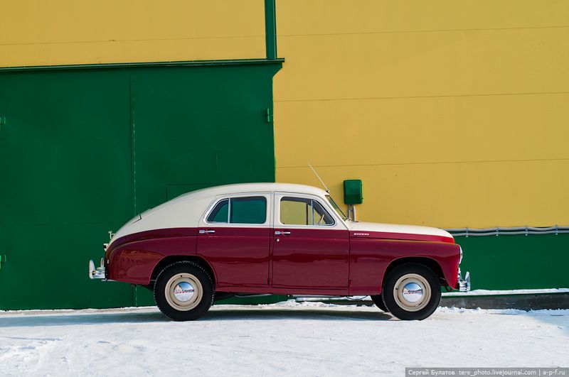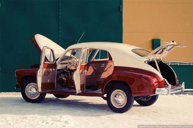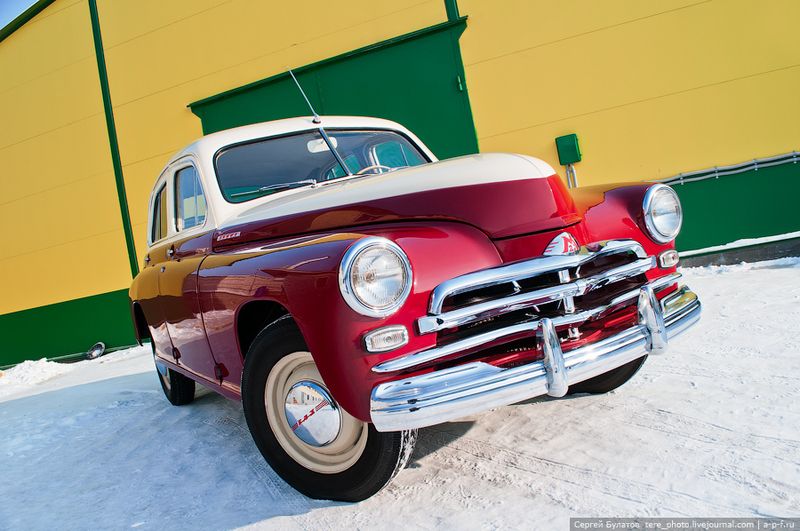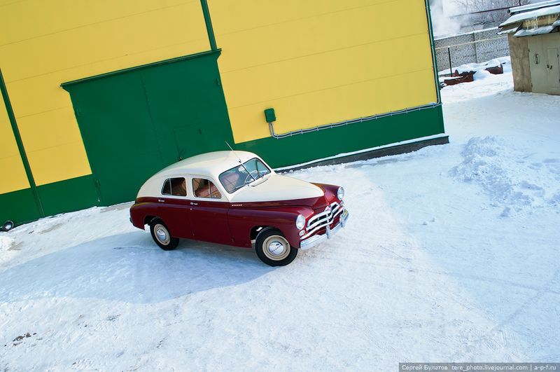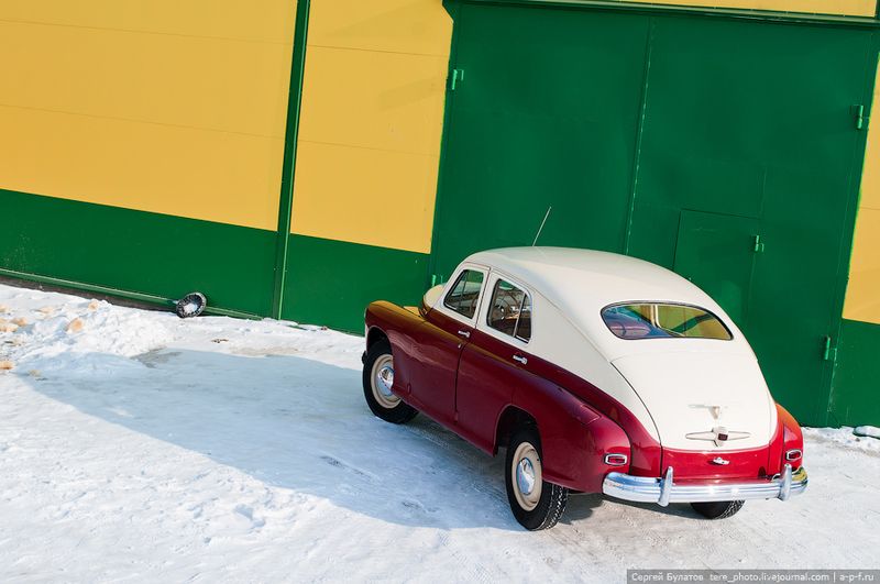 1 Это ГАЗ-М-20 "Победа". Сейчас она полностью, как новая: поворотники включаются, дворники работают, радио играет. Машина на ходу, но прогревается долго. Говорят, ей нужен 66-й бензин, но за неимением такового в продаже двигатель работает на любом.