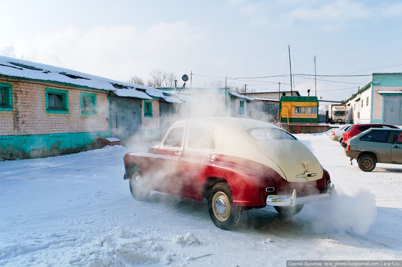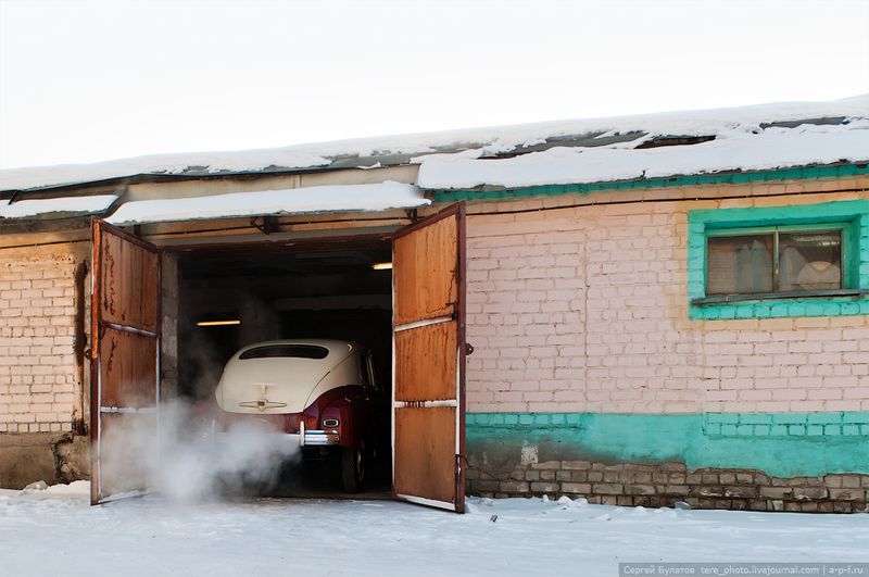 22 Мы хотели выехать на этой Победе за территорию гаражей, пофотографироваться на дороге. Но оказалось, что автомобиль не приспособлен для двидения по снегу (может из-за южных задних шин). Мы ее с трудом переставляли даже на этой площадке - так она буксовала.