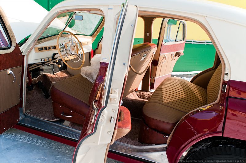 -- Его сделали полностью оригинальным, хотя практически все Победы, которые восстановили другие люди, имеют кожаный или неаутентичный салон. У нас все в оригинале, даже рисунок ткани точно такой же, как у оригинальных Побед. Ткань заказывали в Питере! Весь пластик новый. Обивку крыши также заказывали 2 раза в Питере, но она оказалась неподходящей по размерам, пришлось дошивать и дорабатывать ее вручную. Но самое сложное в салоне - это декоративные рамки окон с покраской под дерево. Они изготавливались по оригинальной технологии с помощью валика и матрицы, а потом дорабатывались вручную. Рисунок наносили тонкой кисточкой.
