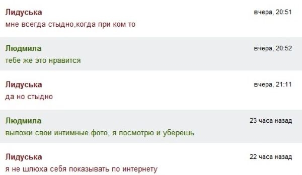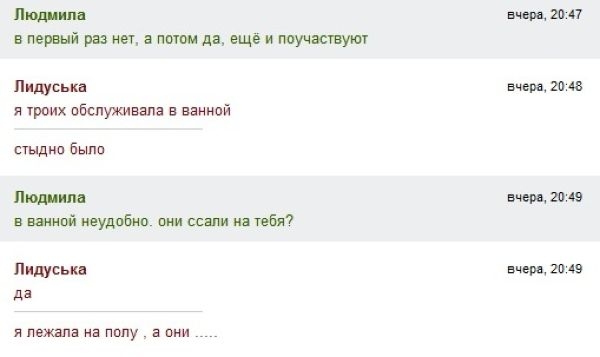 Диалог некой Людмилы, которая явно жирно троллит уникалов на сайтах знакомств, и 31-летней москвички по имени Лидуська, еще той барышни. Какого только опыта у Лидуськи в сексуальной жизни не было - она обслуживала троих в ванной, на нее при этом испражнялись, а Лидуське было стыдно. Но вы не подумайте - она приличная девушка. Интимные фотки в интернете не выкладывает - она же не шлюха какая-нибудь.