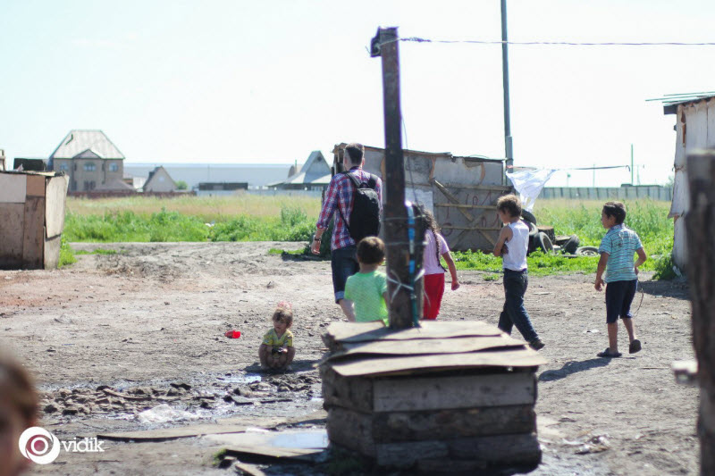И вот мы на месте. Я вижу перед собой одноэтажные дома, сколоченные из фанерных досок. Домики серые и грязные, их всего около 25–30. Первой мы видим цыганку, которая гонит гусей в загон, я тороплюсь достать фотоаппарат, но не успеваю.