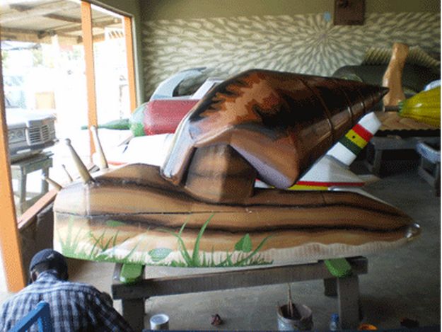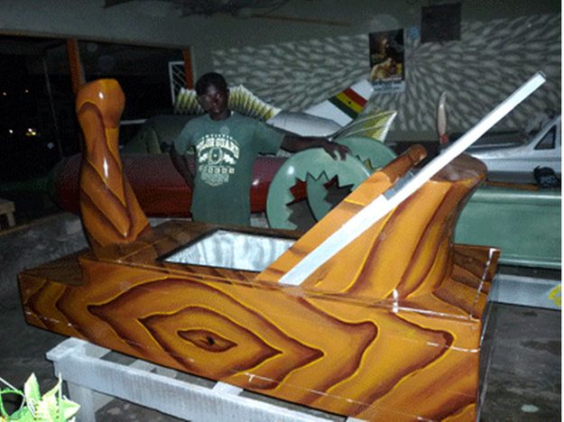 Жители Ганы считают, что отправлять умерших родственников на тот свет в непримечательном деревянном ящике - кощунство. Там к изготовлению каждого гроба подходят индивидуально - последний приют усопшего должен рассказать всему миру о его личности. Вот и появляются такие эксклюзивные столярные изделия.