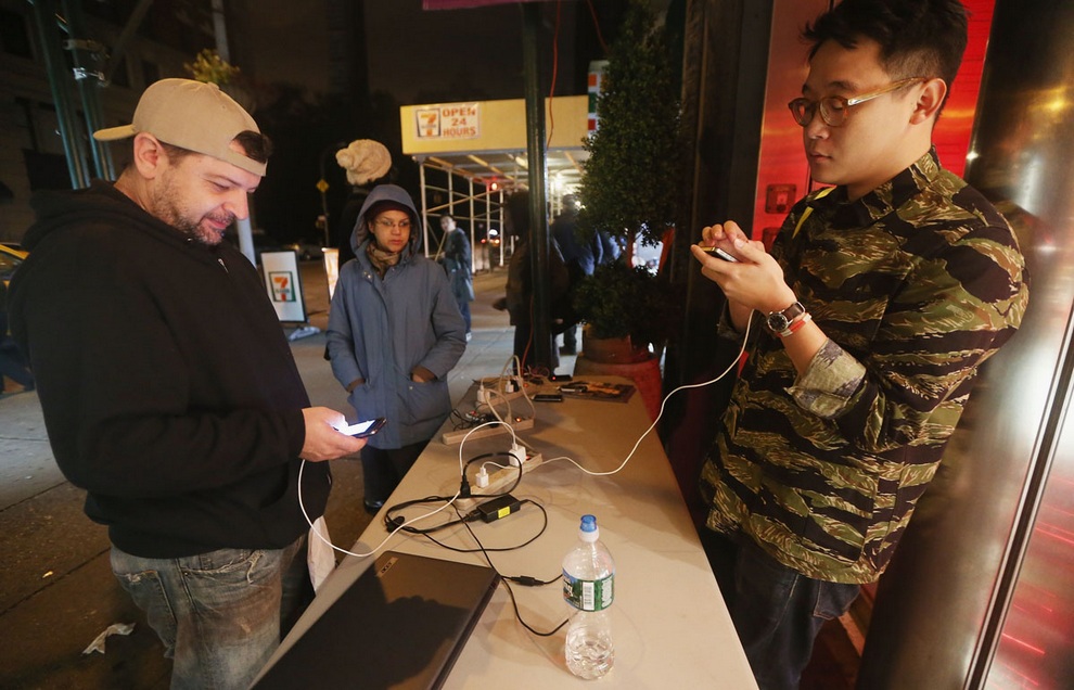 4. Люди заряжают телефоны и ноутбуки на бесплатной зарядной станции магазина «7—11», Манхэттен. (Mario Tama/Getty Images)
