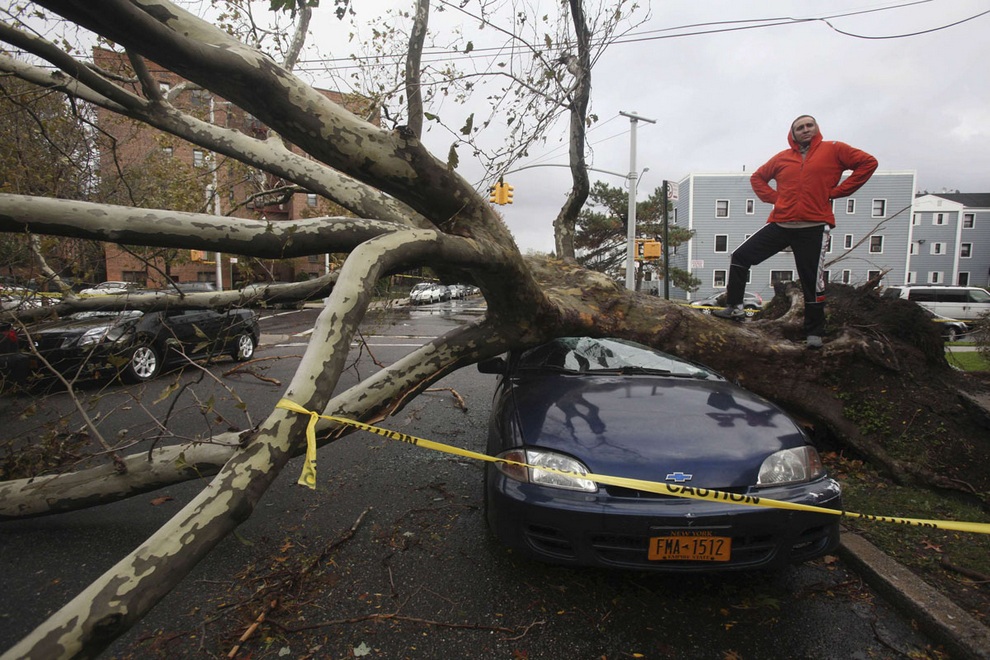 16. Прохожий позирует на упавшем дереве, которое уничтожило припаркованную машину, Куинс. (REUTERS/Gil Cohen Magen)