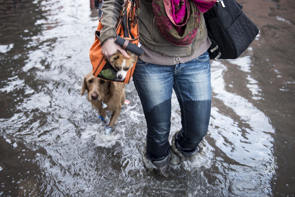 21. Блейн Бадик (Blaine Badick) с собаками покидает свой дом в Хобокене. (BRENDAN SMIALOWSKI/AFP/Getty Images)